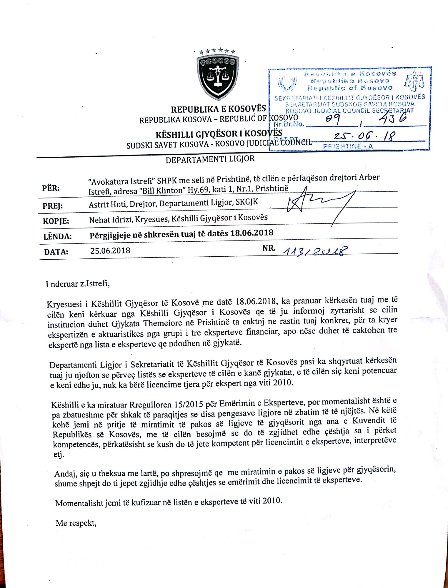 Ne kategorine e praktikes gjyqesore per avokatet (por edhe personat e tjere te interesuar), me tutje publikojme pergjigjen e pranuar nga Keshilli Gjyqesor i Kosoves (KGJK), ne lidhje me ekspertiza financiare, kur kerkohet ekspertiza nga grupi i eksperteve. Meqenese ne Rep. e Kosoves nuk ka institucion adekuat per ekspertiza financiare, kur kerkohet qe ekspertet financiar [...]